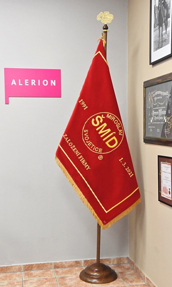 Letos společnost oslavila již 30 let od svého založení a její představitelé se tak rozhodli zvěčnit logo a poselství firmy do vznešené, hmatatelné podoby. Výsledkem je kolekce symbolů, jíž vévodí slavnostní vyšívaný prapor, který nese logo podniku a datum založení. Vyšívaná vlajka se tak stala firemní insignií, která vhodně doplňuje reprezentativní interiér sídla společnosti a je doslovným zhmotněním idejí, vizí a hodnot firmy. Aby prezentace tohoto jedinečného symbolu byla dokonalá, dodali jsme pro jeho vyvěšení dvoudílnou žerď s hlavicí vyhotovenou na zakázku ve tvaru bagru.
