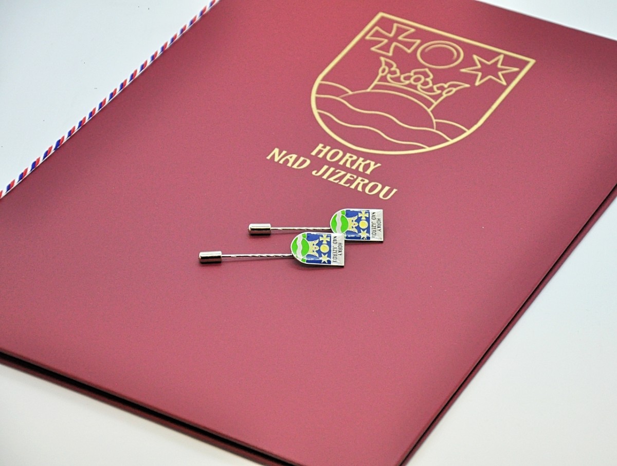Symboly navržené a vyhotovené pro obec Horky nad Jizerou - vyšívaný znak, slavnostní vlajka, prapor starosty, smaltovaný ovál, uvítací cedule, úřední desky a odznaky se znakem a názvem obce.