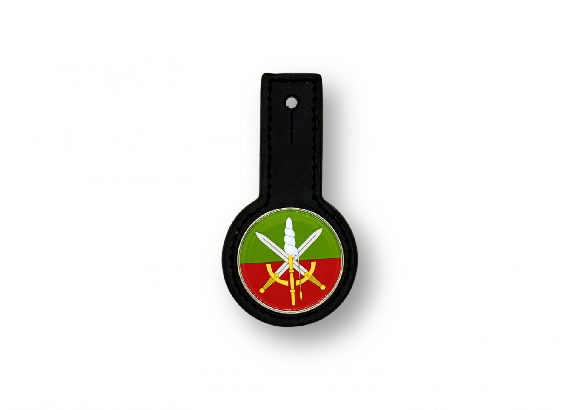 Kožená část je po obvodu opatřena pevným dekorativním stehem laděným v barvě kůže a knoflíkovým prořezem pro snadné upevnění ke stejnokroji. Lakované hrany podtrhují preciznost zpracování a jsou znakem nejvyšší řemeslné kvality. Výsledkem je elegantní a odolný doplněk, který na uniformě působí reprezentativně a profesionálně.